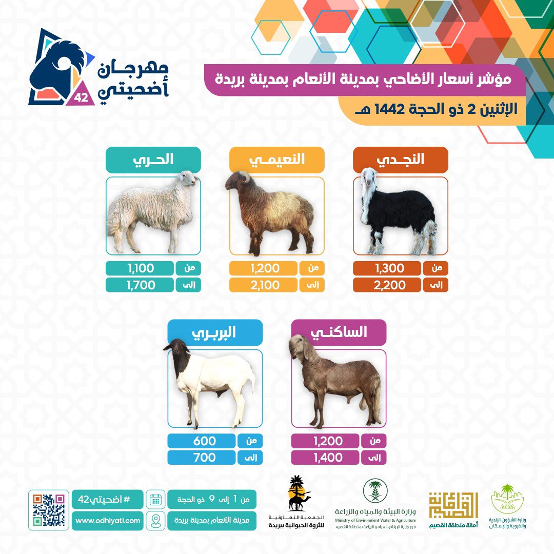 أطلقت أمانة منطقة القصيم مؤشراً لأسعار الأضاحي من مدينة الأنعام بمدينة بريدة اليوم، حيث تضمن المؤشر أسعار النجدي من 1300 إلى 2200 ريال، والنعيمي من 1200 إلى 2100 ريال، والحري من 1100 إلى 1700 ريال، والسواكني من 1200 إلى 1400 ريال والبربري من 600 إلى 700 ريال.