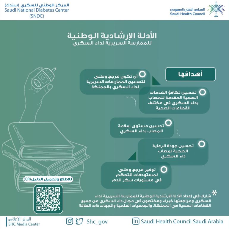 وأفاد أن المجلس الصحي السعودي ممثلاً بالمركز الوطني للسكري أصدر هذه الأدلة بمشاركة فريق علمي من مختلف القطاعات الصحية الحكومية والخاصة، تحقيقاً لأحد أهداف الإستراتيجية الوطنية لداء السكري التي تمت موافقة المجلس الصحي السعودي عليها مؤخراً.