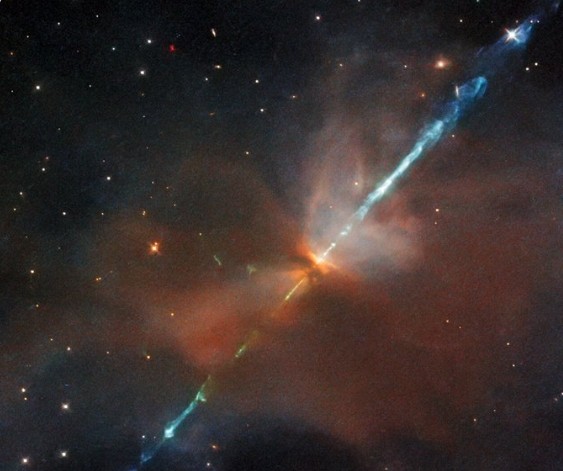 ويتكون هذا “السيف” من نفاثات مزدوجة من غاز مؤيّن فائق السخونة يتصاعد في الفضاء من أقطاب معاكسة لنجم حديث الولادة يسمى IRAS 05491+0247.