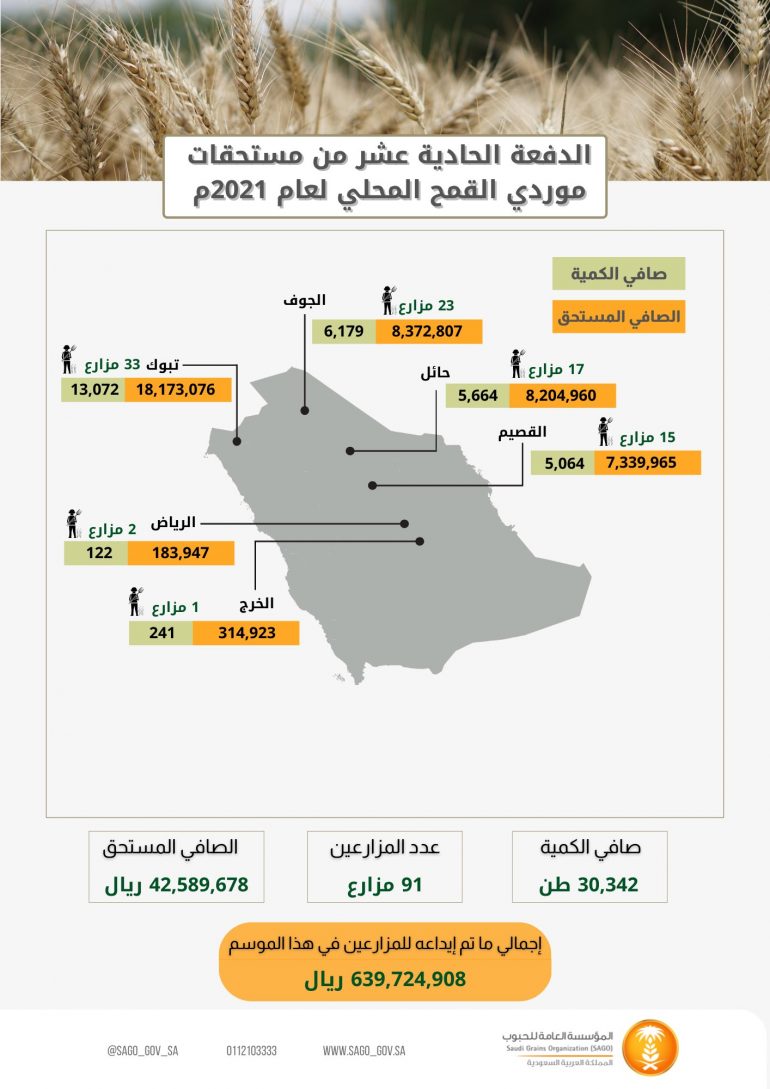 يذكر أن المؤسسة بدأت باستلام القمح المحلي من المزارعين للموسم الحالي اعتباراً من 22 شعبان 1442هـ، حيث بلغ إجمالي الكمية المستلمة من المزارعين حتى تاريخه “557.785” طناً لعدد “2049” مزارعاً.