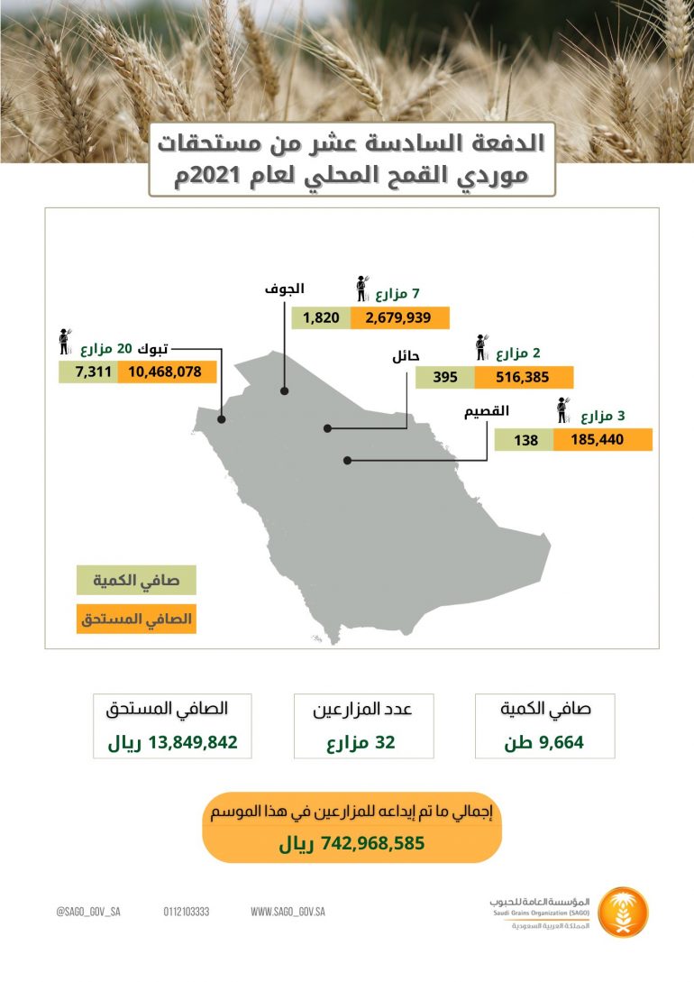 وبلغ إجمالي ما أُودِع في حسابات المزارعين البنكية لهذه الدفعة “13.849.842” ريالاً، لصافي كمية مستلمة “9.664” طنا, لعدد “32” مزارعاً، منهم عدد “6” مزارعين وشركة من أصحاب العلاقة التعاقدية، ليبلغ إجمالي ما أُودِع منذ بداية الموسم “742.968.585” ريالاً لـ “2021” مزارعاً وبكمية “558.687” طناً.