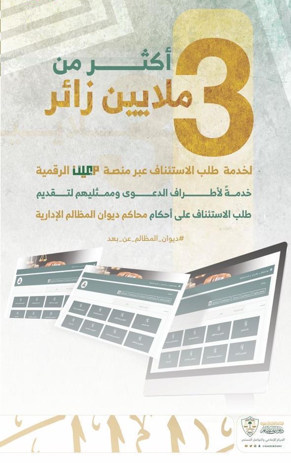 بلغ عدد زوار خدمة طلب الاستئناف في منصة معين الرقمية التابعة لديوان المظالم أكثر من 3.200.000 زائر منذ إطلاقها عام 1439هـ، حيث تُقدم منصة معين الرقمية خدمة طلب الاستئناف كواحدة من عِدة خدمات يرتكز عليها عمل المنصة في تنظيمات التقاضي الرقمي وتيسير كل متطلباته عن بعد للمستفيدين.