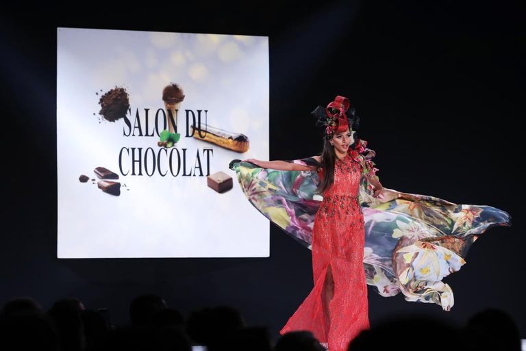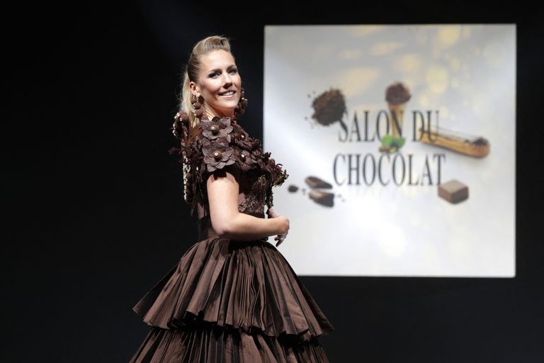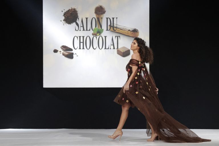شهد افتتاح معرض الشوكولاتة، مؤخرا في باريس، عرضاً مبهراً للأزياء، ارتدت خلاله العارضات فساتين مصنوعة ومطرزة بقطع الشوكولاتة.