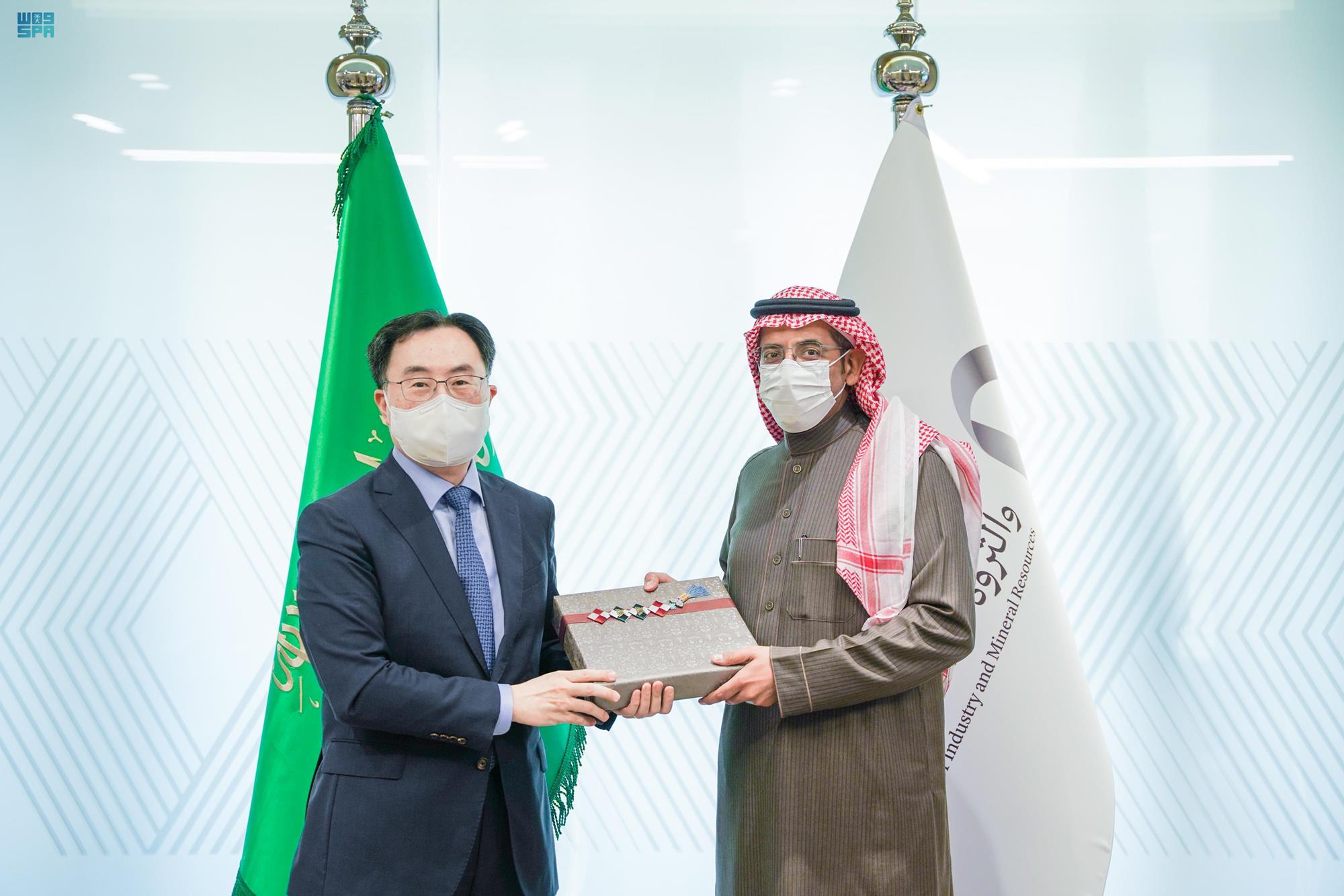 وبحث معاليه مجالات التعاون وفرص الاستثمار بين البلدين في مجالات الصناعات الغذائية، وصناعة السيارات، وصناعة السفن، إضافة إلى صناعة أجهزة التصوير الطبي، ومجالات مستحضرات التجميل والأزياء، والمنتجات الجلدية، مقدمًا الدعوة للشركات الكورية لزيارة المدن الصناعية في المملكة (الهيئة الملكية للجبيل وينبع، مدن)، والتعرف على المزايا التي تتمتع بها المدن، لتنمية الصناعة في المملكة، وجذب الاستثمارات النوعية في العديد من الأنشطة ذات الأولوية.