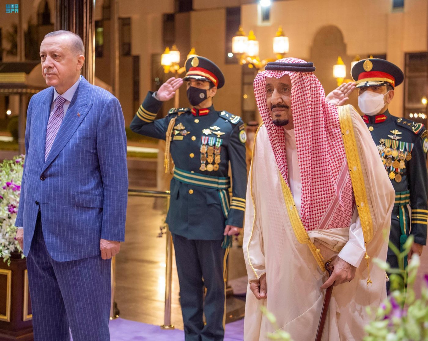 عقب ذلك صحب خادم الحرمين الشريفين الملك سلمان بن عبد العزيز آل سعود، فخامة الرئيس رجب طيب أردوغان رئيس جمهورية تركيا، إلى صالة الاستقبال الرئيسة بالديوان الملكي.