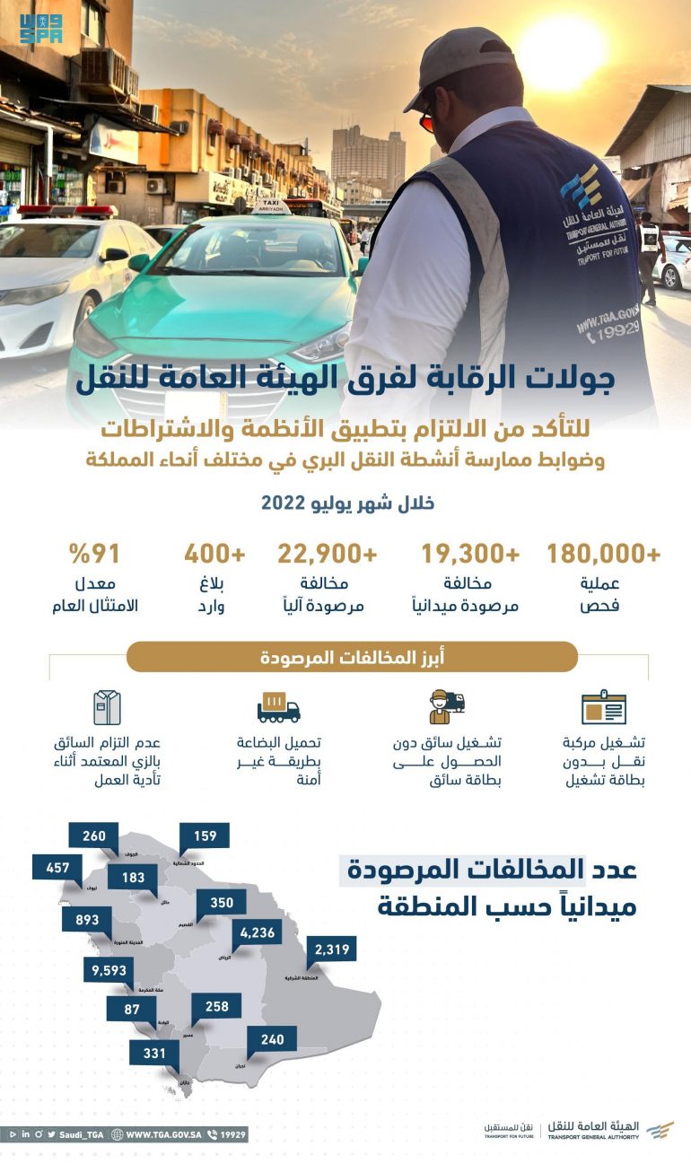 نفّذت الهيئة العامة للنقل، ممثلةً بالإدارة العامة للرقابة وبالتعاون مع الجهات المعنية، حملات رقابية ميدانية خلال شهر يوليو، نتج عنها “181,656” عملية فحص، في أنشطة النقل البري والبحري، منها “178,998” عملية فحص لمركبات النقل، و”273″ عملية فحص للمركبات الأجنبية، فيما بلغت الزيارات الميدانية لمنشآت النقل البري في المملكة “1275” زيارة.