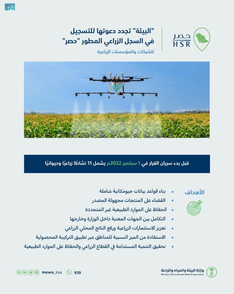 وكان معالي وزير البيئة والمياه والزراعة المهندس عبد الرحمن بن عبد المحسن الفضلي قد دشّن مؤخرًا مشروع السجل الزراعي المطور “حصر”، الذي يستهدف القطاع الزراعي في المملكة بجميع أنشطته الزراعية والحيوانية، وجميع الحيازات الزراعية من خلال قواعد بيانات جيومكانية ويشمل المشروع 11 نشاطًا مختلفًا، وقد وفرت الوزارة أكثر من 655 موظفًا موزعين في 13 منطقة و151 محافظة ووحدة ومكتب تابع للوزارة يعملون على إصدار سجلات زراعية.
