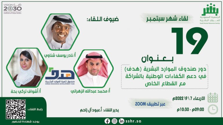 ضمن سلسلة لقاءاتها الشهرية، تعقد الجمعية السعودية للموارد البشرية “بشر” غدا الأربعاء، 7 سبتمبر 2022م، اللقاء الشهري الحادي والعشرين، تحت عنوان “دور صندوق الموارد البشرية (هدف) في دعم الكفاءات الوطنية بالشراكة مع القطاع الخاص” وذلك ضمن مبادراتها لتبادل الخبرات والتجارب الناجحة في مجال الموارد البشرية.