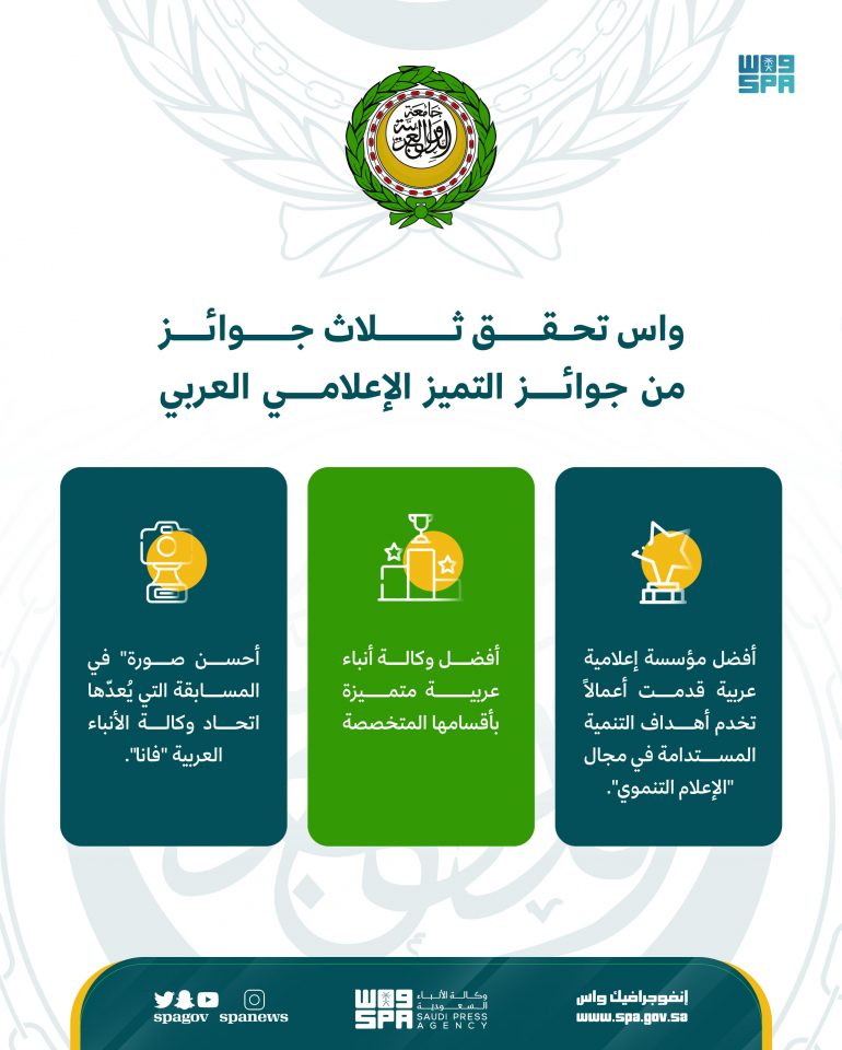 كما تُوجّت “واس” بجائزة أفضل وكالة أنباء عربية متميزة بأقسامها المتخصصة، وحققت وكالة الأنباء السعودية كذلك جائزة “أحسن صورة” في المسابقة التي يُعدّها اتحاد وكالة الأنباء العربية “فانا”.