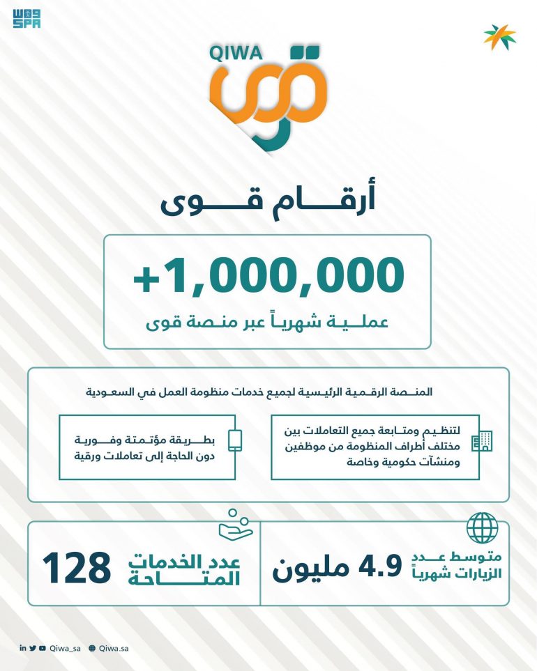 أعلنت منصة “قوى” التابعة لوزارة الموارد البشرية والتنمية الاجتماعية، عن تجاوز عدد العمليات المنفّذة داخل المنصة لمليون عملية شهرياً، وأكثر من 4.9 ملايين متوسط عدد الزيارات للمنصة شهرياً.