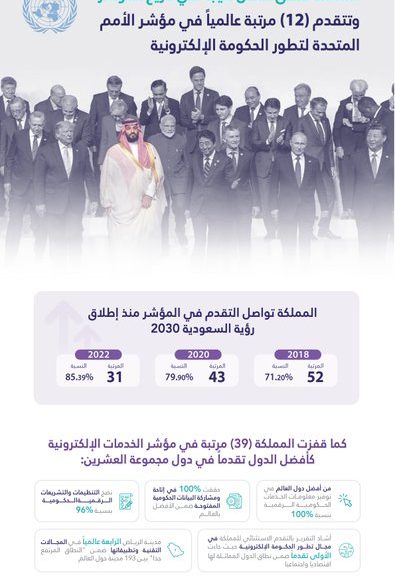 حققت المملكة أعلى نتيجة تاريخية لها في مؤشر تطور الحكومة الإلكترونية الصادر عن الأمم المتحدة منذ إطلاقه قبل أكثر من 20 عاماً، حيث حصلت على المرتبة 31 هذا العام 2022، مقارنة مع المرتبة 43 في عام 2020.
