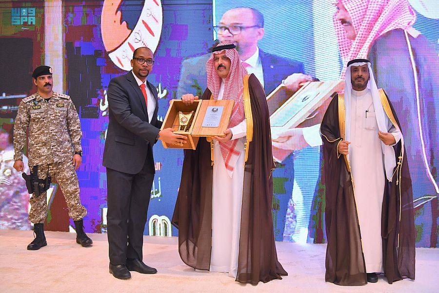 وكرم سمو أمير المنطقة في ختام الحفل المشاركين والمسهمين في إقامة الملتقى، مطلعاً على جناح القهوة، ولوحات الفن التشكيلي.