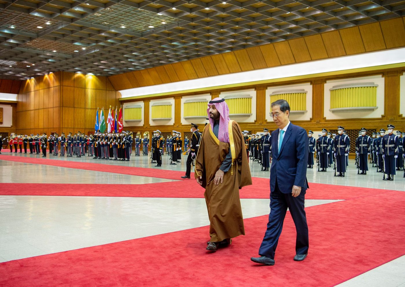 وقد أجريت لسمو ولي العهد مراسم استقبال رسمية، حيث عزف السلامان الملكي السعودي، والوطني الكوري، واستعراض حرس الشرف.