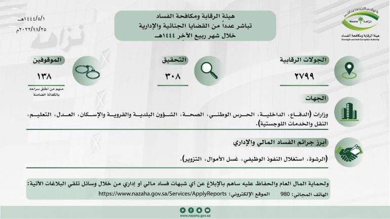 باشرت هيئة الرقابة ومكافحة الفساد، خلال شهر ربيع الآخِر 1444هـ، اختصاصاتها ومهامها من خلال عمل (2799) جولة رقابية، والتحقيق مع (308) مشتبه فيهم؛ من ضمنهم موظفون من وزارات (الدفاع، الداخلية، الحرس الوطني، الصحة، الشؤون البلدية والقروية والإسكان، العدل، التعليم، النقل والخدمات اللوجستية)، وإيقاف (138) مواطناً ومقيماً، وفقاً لنظام الإجراءات الجزائية.