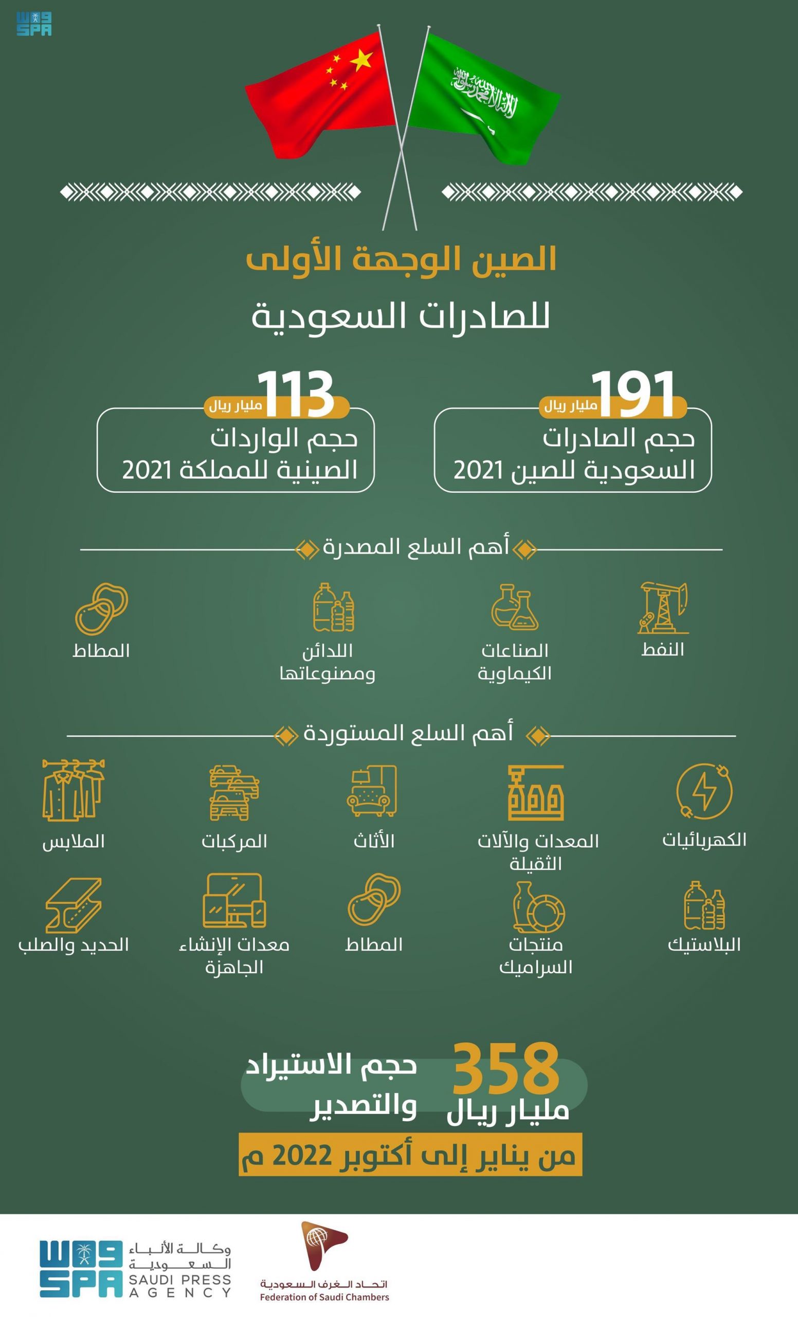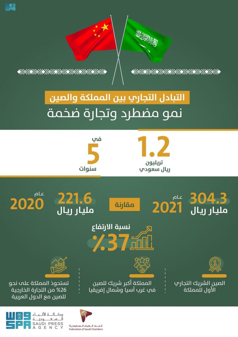 وأشار التقرير إلى النمو المطرد في حجم التبادل التجاري بين المملكة والصين والذي بلغ في عام 2021م 304.3 مليار ريال مقابل 221.6 مليار ريال في عام 2020م، مرتفعاً بنسبة 37% ، وفي ذات العام ارتفعت الصادرات السعودية إلى الصين 59% والواردات بنسبة 12%.