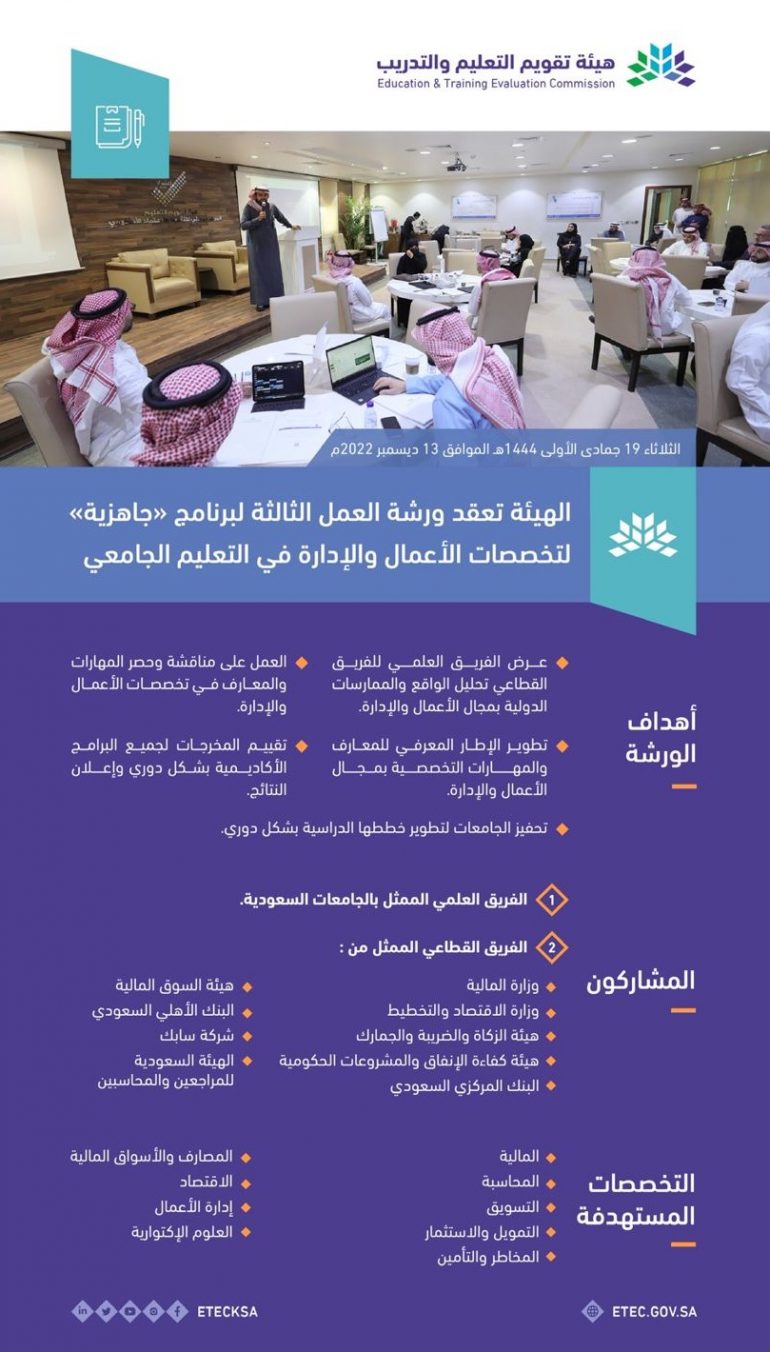 وتعدُ الورشة ضمن سلسلة ورش برنامج “جاهزية” الذي تعمل عليه هيئة تقويم التعليم والتدريب لرفع جاهزية خريجي التعليم العالي لسوق العمل، حيث تعد هذه الورشة السادسة لعمل المعايير الأكاديمية التخصصية ونواتج التعلم في تخصصات المرحلة الاولى والتي تشمل تخصصات الأعمال والإدارة.
