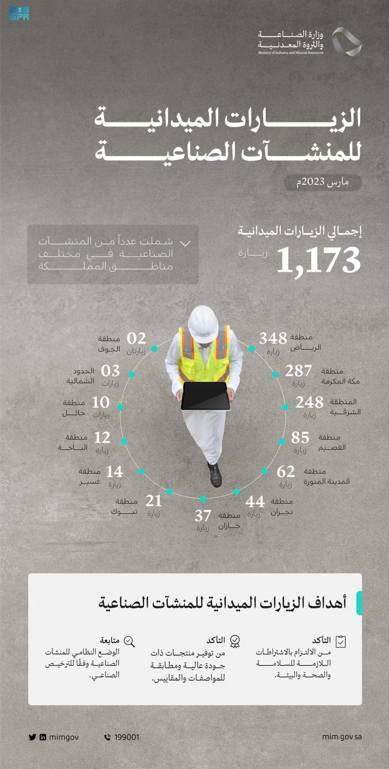 في إطار جولات وزارة الصناعة والثروة المعدنية الدورية لمتابعة المصانع، والوقوف على مدى جاهزيتها، والتأكد من التزامها بتطبيق معايير الجودة والاشتراطات اللازمة.. نفذت الوزارة، ممثلة بالإدارة العامة لمراكز الخدمة الشاملة الصناعية وإدارة الالتزام، “1173” زيارة ميدانية على المنشآت الصناعية في عدد من مناطق المملكة خلال شهر مارس الماضي.