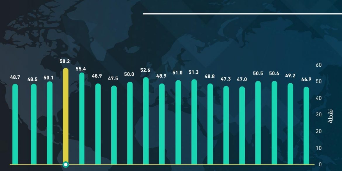 وارتفع المؤشر من 56.9 نقطة في شهر ديسمبر 2022م إلى 58.2 نقطة في شهر يناير 2023م، بزيادة واضحة عن المستوى المحايد البالغ 50 نقطة، وهو الحد الفاصل بين النمو والانكماش، وتعتبر نتيجة المؤشر هي ثاني أعلى مستوى مسجّل منذ سبتمبر 2021م.