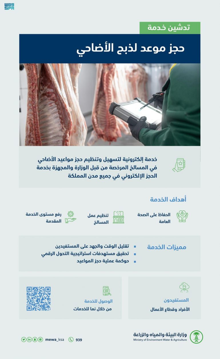 وتهدف هذه الخدمة إلى تنظيم عمل المسالخ، وتقليل وقت الانتظار، ورفع مستوى الخدمة المقدمة، والإسهام في الحفاظ على البيئة والصحة العامة، وذلك في إطار تحقيق التحول الرقمي وحوكمة الخدمات الإلكترونية التي تقدمها الوزارة.