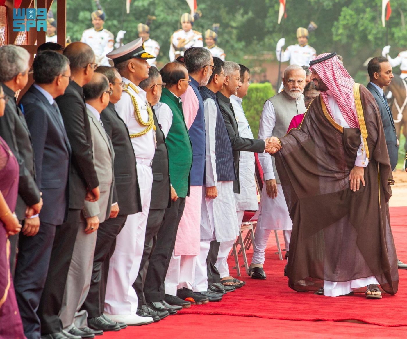 بعد ذلك عزف السلامان الملكي السعودي والجمهوري الهندي، ثم استعرض حرس الشرف.