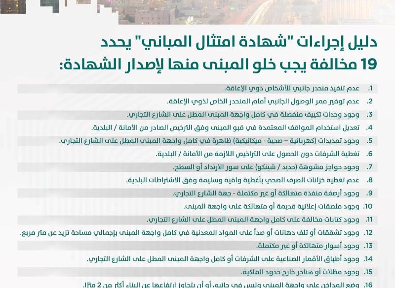 ويتضمَّن دليل إجراءات “شهادة امتثال المباني” 19 مخالفة يشترط خلو المباني منها لإصدار الشهادة، أبرزها؛ عدم تنفيذ المنحدر الجانبي أو ممر الوصول الجاني للأشخاص ذوي الإعاقة،وفق دليل معاير الوصول الشامل للمنشآت،بالإضافة إلى وجود وحدات تكييف منفصلة أو تمديدات كهربائية أو صحية أو ميكانيكية ظاهرة في واجهة المبنى المطل على الشارع التجاري.