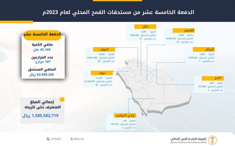 أعلنت الهيئة العامة للأمن الغذائي عن صرف مستحقات الدفعة الخامسة عشرة لمزارعي القمح المحلي، الذين قاموا بتوريد الكميات المخصصة لهم لهذا الموسم 1444/ 1445هـ، وإغلاق حساباتهم عبر المنصة الإلكترونية “محصولي” على الموقع الرسمي للهيئة.