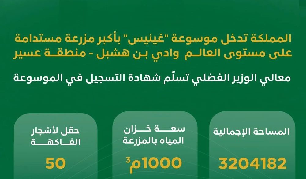 سجّلت المملكة رقمًا قياسيًا جديدًا في مجال الزراعة، بدخول إحدى المزارع الإرشادية التابعة للوحدة البحثية للزراعة بالمياه المجدّدة بوادي بن هشبل في منطقة عسير؛ قائمة موسوعة غينيس” العالمية للأرقام القياسية؛ كأكبر مزرعة في العالم من حيث المساحة.
