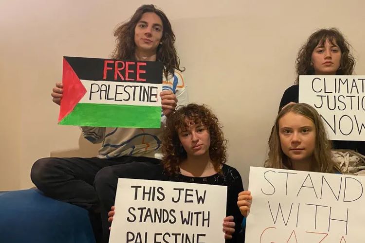وظهرت غريتا في الصورة وهي تحمل لافتة كتب عليها “تضامن مع غزة”، في حين حملت صديقاتها الثلاث لافتات تقول “فلسطين حرة”، و”هذه اليهودية تقف إلى جانب فلسطين”، و”العدالة المناخية الآن”.