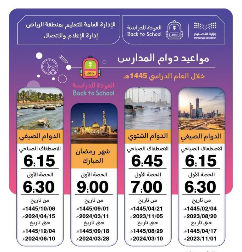 يبدأ الأحد القادم 21-1445هـ الموافق 5-11-202م الدوام الشتوي في مدارس الإدارة العامة للتعليم بالرياض، وسيكون الاصطفاف الصباحي عند الساعة الـ6:45، وبداية الحصة الأولى الساعة الـ7:00 صباحًا.