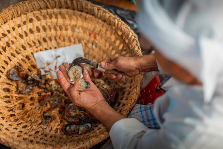 وعاش الزوار تجربة فتح الاصداف بشكل حي من خلال ما يُعرف بـ “فلق الصدفة” للبحث عن اللؤلؤ بين جنباتها، ليكتشفوا بأن هناك احجام مختلفة للحجر الكريم الذي يستغرق سنوات طويلة ليتكون ويصل للأحجام الكبيرة، والتي يطلق عليها أسم “الدانة” وهي اللؤلؤة الكبيرة في الحجم، يليها مسميات عديدة للأحجام المختلفة ومنها “الحصباة“، و”البدلة”، و”اليكة”، و”الفص”، و”الخشرة“.