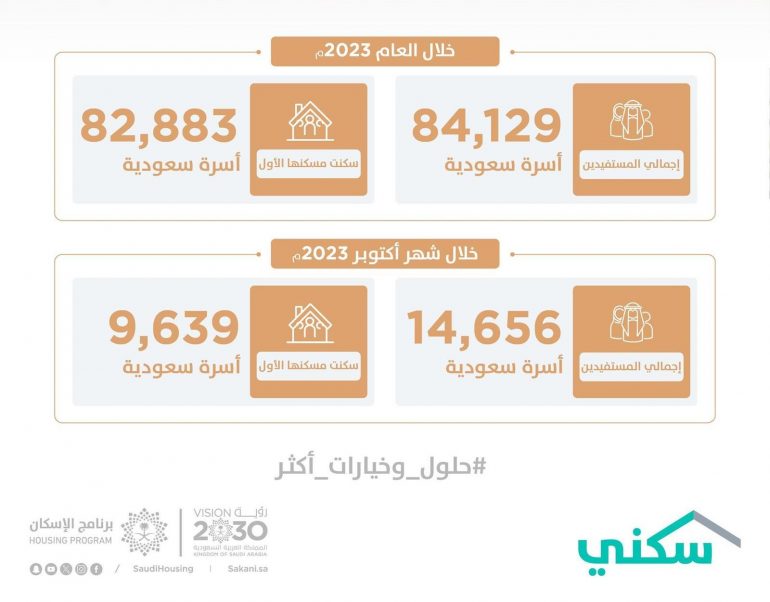 استفادت 84,129 أسرة من برنامج “سكني” منذ بداية العام الجاري حتى نهاية أكتوبر 2023، في حين بلغ عدد الأسر التي سكنت مسكنها الأول منذ بداية العام 82,883 أسرة، وذلك في إطار الجهود المستمرة لتوفير منتجات سكنية متعددة، وحلول تمويلية متنوعة، تسهم في تحقيق أهداف برنامج الإسكان (أحد برامج رؤية المملكة 2030) برفع نسبة التملك للأسر السعودية إلى 70% بحلول العام 2030.