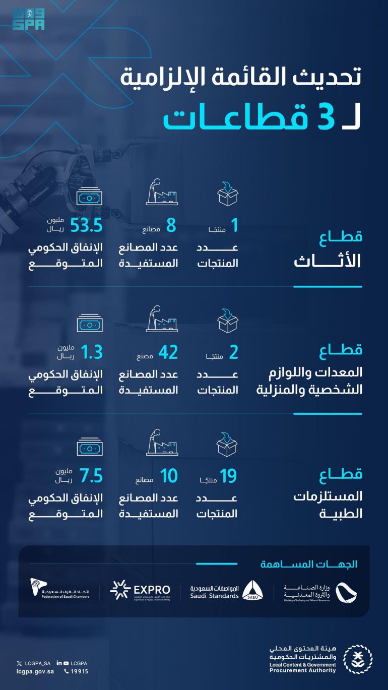 وأشارت إلى أن تحديث القائمة الإلزامية لهذه القطاعات الثلاثة يأتي ضمن جهود الهيئة في تفعيل الآليات التي حددتها لائحة تفضيل المحتوى المحلي والمنشآت الصغيرة والمتوسطة والشركات المدرجة في السوق المالية في الأعمال والمشتريات؛ إذ إن هناك 60 مصنعًا مستفيدًا لديها القدرة الإنتاجية على تلبية الطلب الحكومي. ومن المتوقع أن يتجاوز حجم الإنفاق الحكومي 61 مليون ريال سعودي.