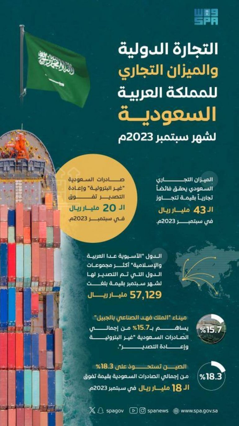 كشفت بيانات أولية للتجارة الدولية للسعودية عن تحقيق الميزان التجاري في المملكة العربية السعودية فائضًا بقيمة 43,735 مليار ريال في شهر سبتمبر 2023م، ليعد بذلك ثالث أكبر فائض شهري لهذا العام بعد أن حقق أعلى مستوياته في شهر أبريل، ثم حقق ثاني أعلى فائض له في شهر فبراير.