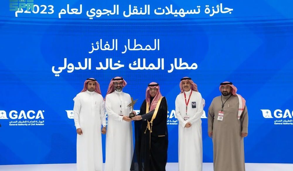 سلم معالي رئيس الهيئة العامة للطيران المدني الأستاذ عبدالعزيز بن عبدالله الدعيلج اليوم، جائزة تسهيلات النقل الجوي لعام 2023 لمطار الملك خالد الدولي بوصفه أفضل مطار التزامًا بالبرنامج الوطني للتسهيلات، بحضور الرؤساء التنفيذيين والمسؤولين والمديرين من ممثلي الشركات والناقلات الوطنية العاملة في قطاع الطيران المدني بالمملكة.