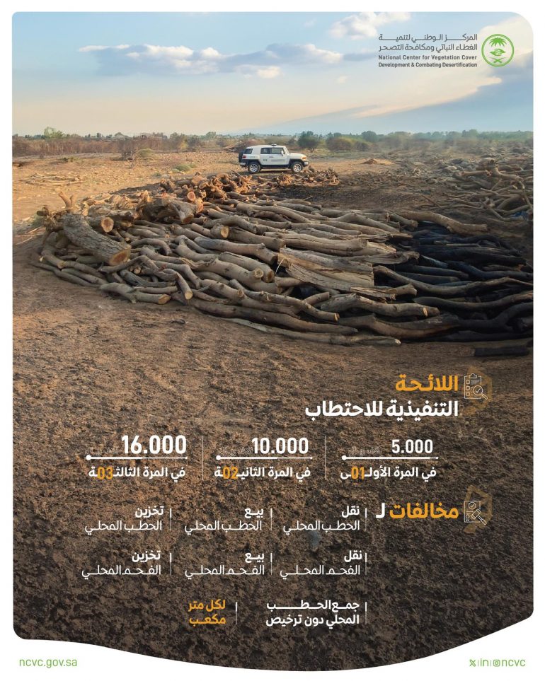 وأوضح المركز أن غرامة هذه المخالفات، التي حددتها اللائحة، تبدأ من 5 آلاف ريال لكل متر مكعب من الحطب أو الفحم المحلي إذا كانت المخالفة لأول مرة، ثم تُضاعف إلى 10 آلاف ريال في المرة الثانية، لتصل في حال التكرار لمرة ثالثة إلى 16 ألف ريال لكل متر مكعب.