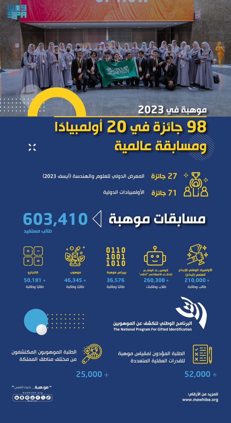 وأشار التقرير -الذي يلخص أبرز إنجازات “موهبة” خلال العام 2023- إلى تحقيق نجاحات لافتة في المسابقات العلمية الدولية، حيث وصل رصيد طلاب المملكة إلى 610 ميداليات وجوائز في المسابقات العلمية الدولية؛ منها 71 جائزة خلال مشاركاتهم بالأولمبيادات الدولية في عام 2023، تمثلت في 59 ميدالية و12 شهادة تقدير، إضافةً إلى حصولها على 27 جائزة عالمية علمية في معرض آيسف الدولي للعلوم والهندسة “آيسف 2023″، لترفع المملكة رصيد جوائزها في معرض آيسف إلى 133 جائزة، منها 92 جائزة كبرى، و41 جائزة خاصة، منذ أن بدأت مشاركاتها في المعرض عام 2007م.