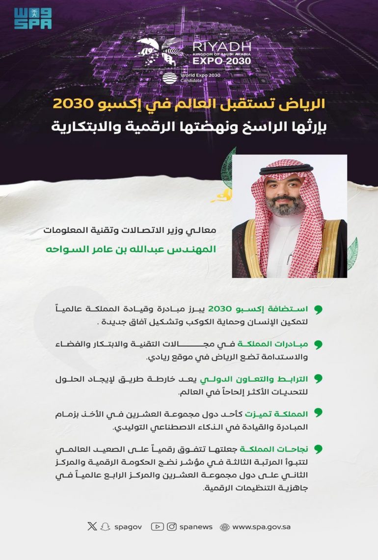 وقال معاليه: “إن استضافة المملكة لهذا الحدث المهم هي ثمرة لدعم وقيادة سمو ولي العهد – حفظه الله – لهذا الملف، لتكون المملكة محط أنظار العالم، كمنصة فريدة تفتح آفاقًا للمستقبل وتستقبل العالم بإرثها الراسخ ونهضتها الرقمية والابتكارية وثقافتها المتنوعة”.