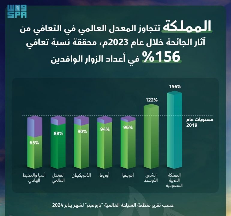 كشف تقرير منظمة السياحة العالمية (باروميتر) الصادر في شهر يناير 2024 عن تحقيق المملكة العربية السعودية تعافيًا بنسبة 156% في أعداد السياح الوافدين خلال عام 2023 مقارنة بعام 2019.