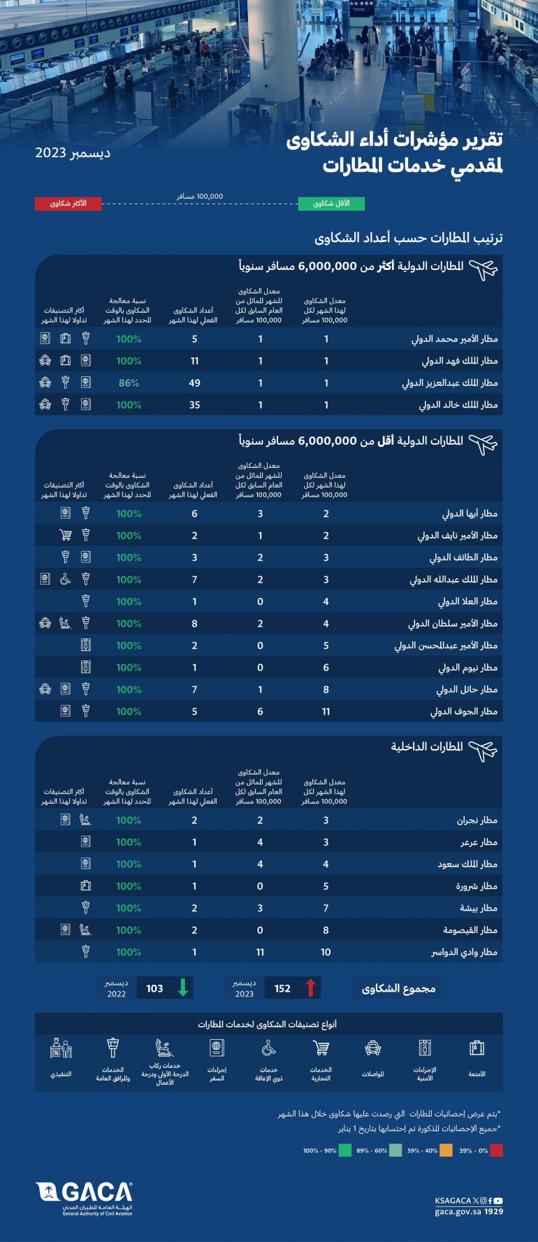 تعزيزًا للشفافية، وتحفيزًا للمنافسة العادلة، أصدرت الهيئة العامة للطيران المدني اليوم مؤشر تصنيف مقدمي خدمات النقل الجوي والمطارات من واقع عدد الشكاوى المرفوعة من المسافرين للهيئة خلال شهر ديسمبر 2023.