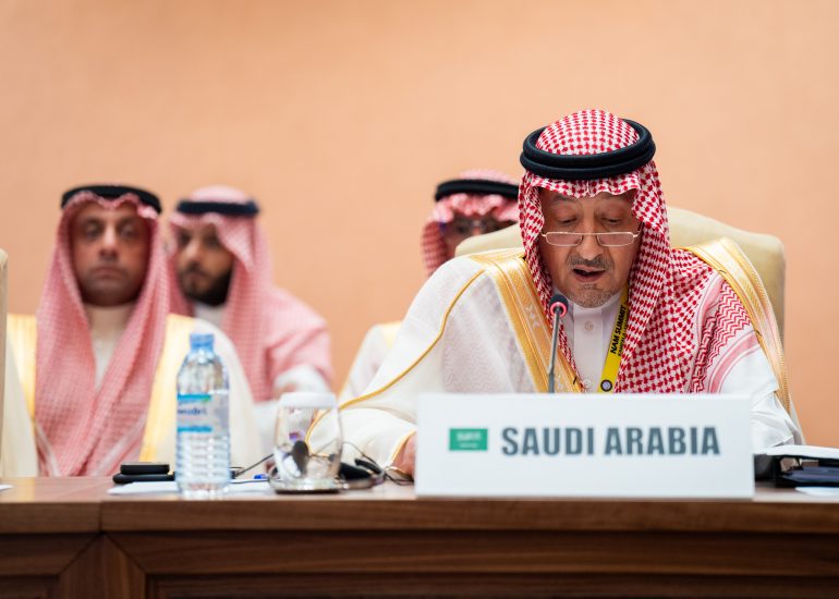 ونقل معاليه في بداية الكلمة تحيات وتقدير خادم الحرمين الشريفين وسمو ولي العهد رئيس مجلس الوزراء –حفظهما الله- لأصحاب الفخامة والمعالي المشاركين في القمة.