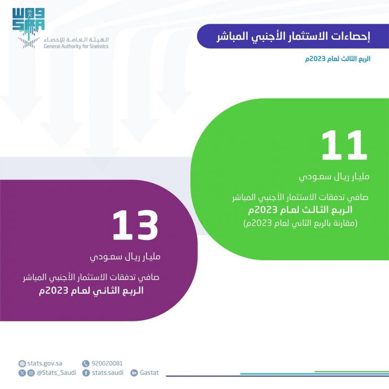 وفي ذات السياق نشرت الهيئة إحصاءات الاستثمار الأجنبي المباشر للربع الثالث من عام 2023م، مشيرةً إلى أن إجمالي التدفقات الداخلة للاستثمار الأجنبي المباشر في المملكة بلغت 17 مليار ريال سعودي، كما بلغ إجمالي التدفقات الخارجة للاستثمار الأجنبي المباشر في المملكة 5 مليارات ريال سعودي، فيما بلغ صافي تدفقات الاستثمار الأجنبي المباشر في المملكة 11 مليار ريال سعودي.