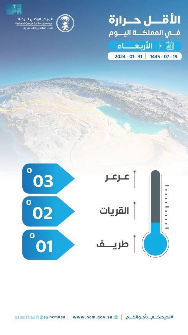 طريف تسجّل أدنى درجة حرارة بالمملكة سجّلت محافظة طريف بمنطقة الحدود الشمالية اليوم، درجة مئوية واحدة كأدنى درجة حرارة على مستوى مدن ومحافظات المملكة. جاء ذلك بحسب التقرير الصادر عن المركز الوطني للأرصاد.