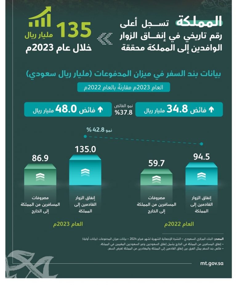 كشفت بيانات البنك المركزي السعودي الأولية الخاصة ببند السفر في ميزان المدفوعات عن تحقيق المملكة العربية السعودية رقمًا قياسيًا جديدًا في إنفاق الزوار القادمين إلى المملكة من الخارج خلال عام 2023م، وذلك بإجمالي إنفاق يصل إلى 135 مليار ريال. ويعد هذا الرقم هو الأعلى في تاريخ المملكة فيما يتعلق بإنفاق الزوار القادمين من الخارج، ويمثل هذا الإنفاق نسبة نمو قدرها 42.8% مقارنة بعام 2022م.