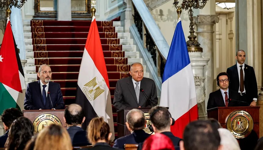 طالبت مصر والأردن وفرنسا، يوم السبت، بوقف دائم لإطلاق النار في قطاع غزة وإطلاق سراح كافة الرهائن والمحتجزين، ورفضت أي عمل عسكري في مدينة رفح الفلسطينية، وذلك في اجتماع لوزراء خارجية الدولة الثلاث في القاهرة.