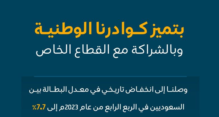 انخفض معدل البطالة بين السعوديين من الجنسين في القطاع الخاص إلى 7.7%، وهو أدنى مستوى تاريخي له، وفقًا لما كشفت عنه نشرة سوق العمل للربع الرابع من عام 2023. وتعكس هذه النتائج الإيجابية استمرار سوق العمل السعودي في التوسع باستقطاب الكوادر الوطنية.