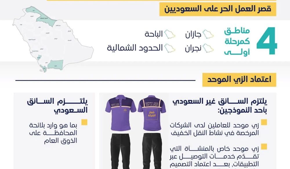إضافة لذلك، فقد اعتمدت الهيئة زياً موحداً للسائقين غير السعوديين من خلال نموذجين، يكون الأول زيّاً مخصصاً للعاملين بشكل مباشر لدى الشركات المرخصة في نشاط النقل الخفيف، ويكون الآخر زيّاً موحداً خاصاً بالمنشأة التي تقدّم خدمات التوصيل عبر التطبيقات، بعد اعتماد التصميم وأخذ موافقة الهيئة العامة للنقل.