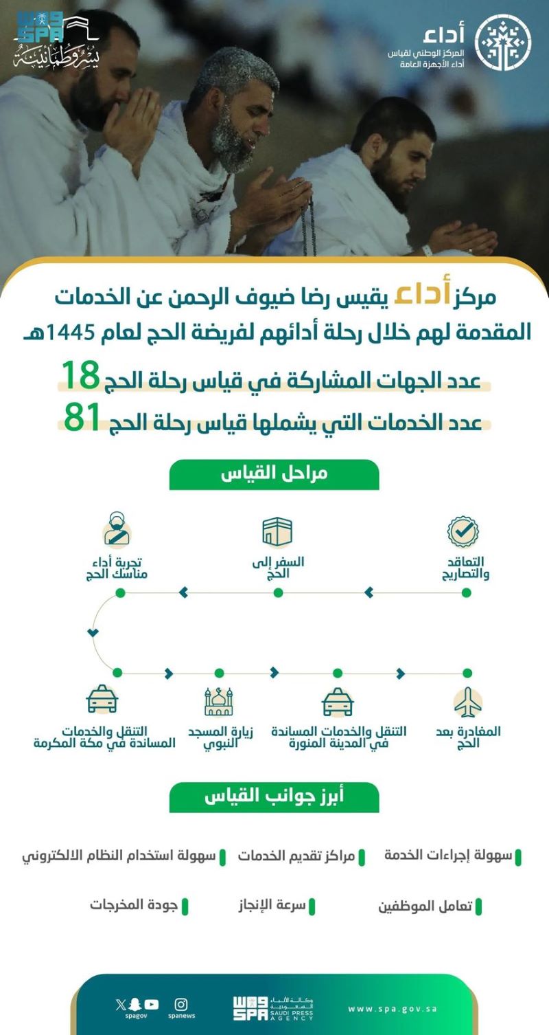 يقوم المركز الوطني لقياس أداء الأجهزة العامة “أداء” بقياس رحلة أداء الحج لهذا العام 1445هـ، مستهدفاً 81 خدمة تقدمها 18 جهة حكومية، لحجاج بيت الله الحرام، وذلك بهدف معرفة مستوى رضاهم عن الخدمات المقدمة لهم خلال رحلة أدائهم لفريضة الحج وزيارة المسجد النبوي الشريف، تحقيقاً لما تضمنته رؤية المملكة 2030.