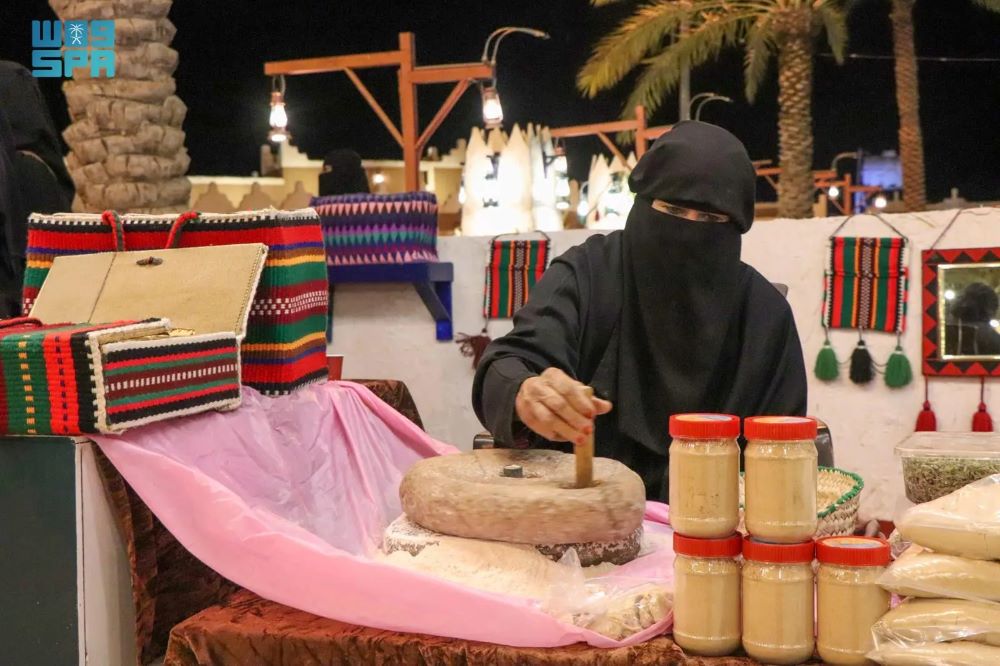 وفي هذا الجانب، قدمت أم سالم البالغة من العمر 75 عاماً, نموذجاً ومثالاً للحياة القديمة لطريقة طحن الحبوب بأداة “الرحى، حيث تتكون من حجرين دائريين، يوضعان فوق بعضهما، فيما يكون الجزء العلوي أكبر قليلاً من الجزء السفلي الذي يكون ثابتاً، ووسطها ثقب صغيرة لإدخال الحبوب، وفي طرفها عصا خشبية لعملية الدوران؛ لتأخذ أفكار الزوار والسياح إلى حقبة زمنية ماضية تعايشوا خلالها واقع الحياة وطرق توفير احتياجاتهم الغذائية.