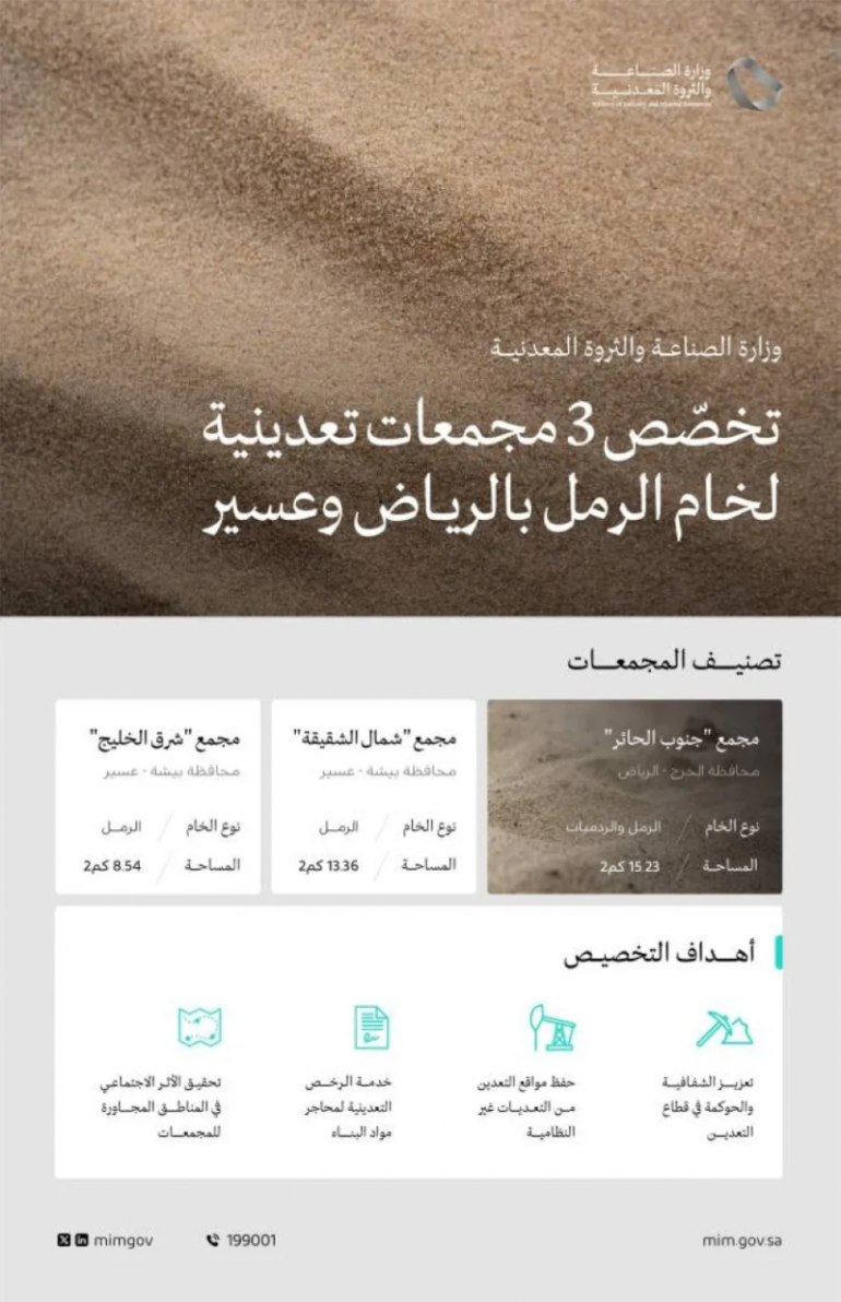 كشفت وزارة الصناعة والثروة المعدنية عن تخصيصها ثلاثة مواقع لإقامة مجمعات تعدينية لخام الرمل والردميات في منطقتي الرياض وعسير، سعيًا منها لتطوير البيئة الاستثمارية التعدينية في المملكة، وتعزيز شفافيتها وجاذبيتها للمستثمرين، وخدمة للرخص التعدينية في قطاع محاجر مواد البناء بوجه خاص.