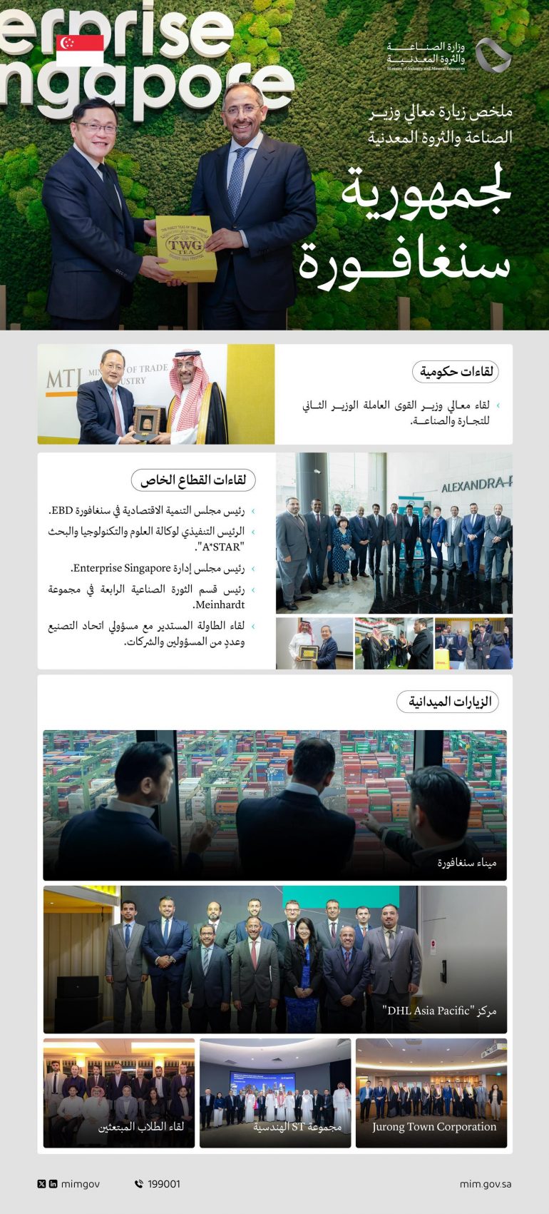 وتأتي الزيارة الرسمية لمعالي وزير الصناعة والثروة المعدنية إلى جمهورية سنغافورة، في إطار جولة اقتصادية لشرق آسيا تشمل الصين وسنغافورة، يرأس خلالها معاليه وفد منظومة الصناعة الثروة المعدنية؛ بهدف تعزيز الروابط الثنائية، وجذب الاستثمارات النوعية إلى المملكة، والبحث عن فرص استثمارية متبادلة في القطاع الصناعي.